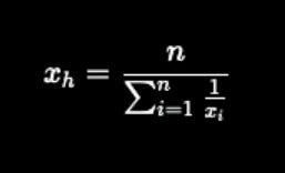↳ Take the reciprocal of each number in a dataset. Add them up. Then divide the number of values in the dataset by that sum.