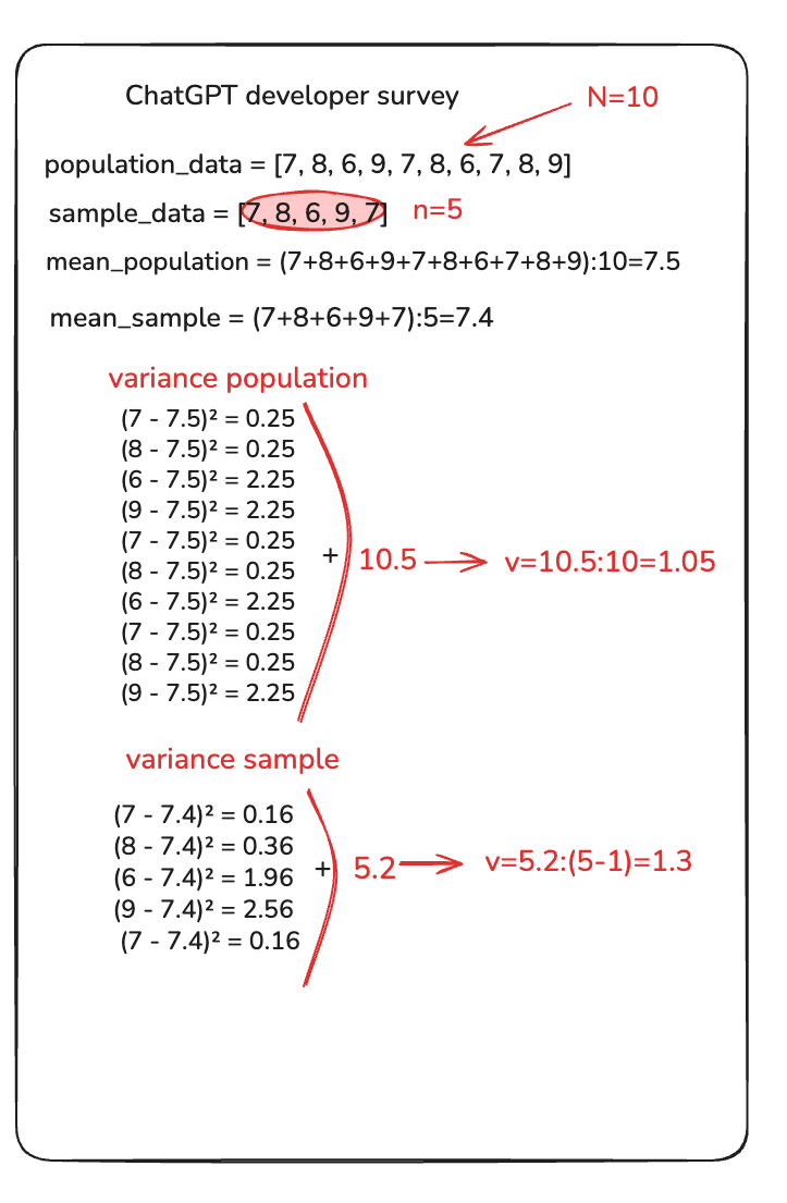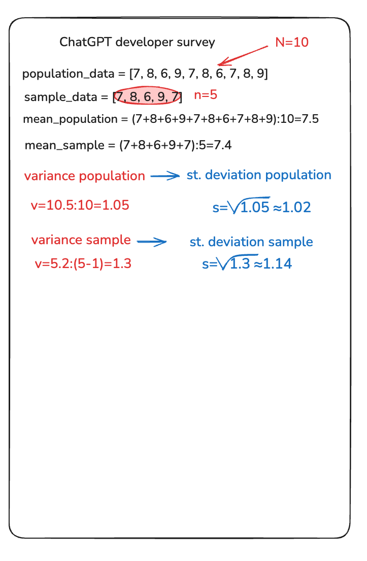 Suppose you ask 10 developers to rate ChatGPT on a scale from 1 to 10. Your population is 10 developers, and you randomly select 5 of those responses as a sample.