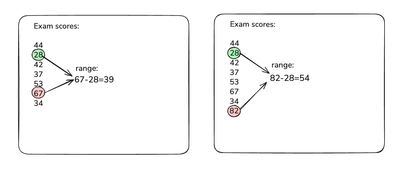 Let’s explore a simple example of a range for exam scores. The lowest score is 28 and the highest is 67, so the range is 39 points.